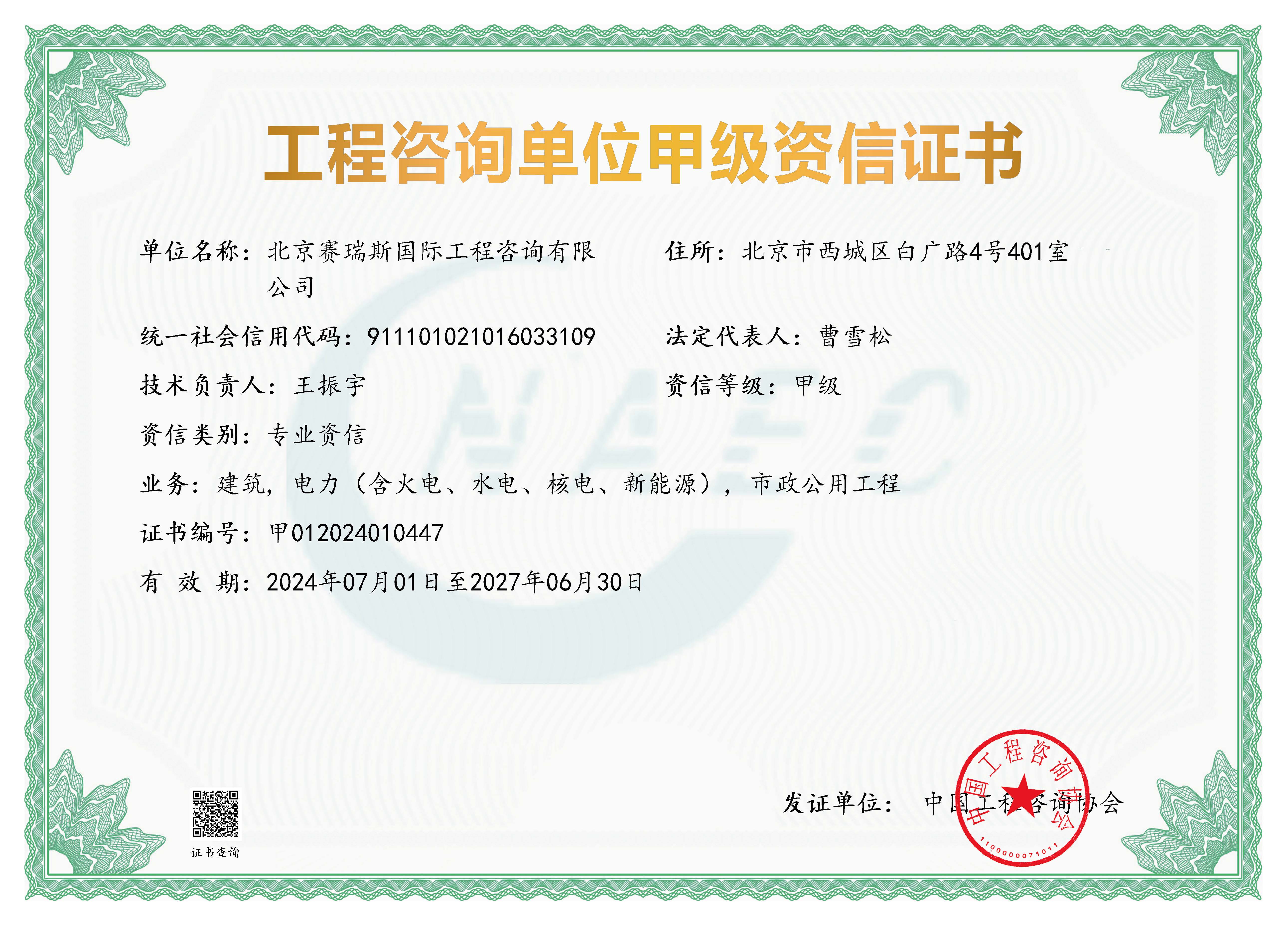 工程咨詢單位甲級(jí)資信,是我國(guó)工程咨詢領(lǐng)域經(jīng)國(guó)家權(quán)威機(jī)構(gòu)認(rèn)證的最高等級(jí)資質(zhì)。電力專業(yè)的認(rèn)證,代表著公司在電力工程咨詢領(lǐng)域具備卓越的技術(shù)實(shí)力、豐富的項(xiàng)目經(jīng)驗(yàn)和嚴(yán)格的質(zhì)量管控能力。此次成功榮膺,不僅是國(guó)家相關(guān)主管部門對(duì)賽瑞斯在電力工程咨詢服務(wù)中專業(yè)水平、綜合實(shí)力及良好信譽(yù)的高度認(rèn)可,更是公司多年來(lái)在電力領(lǐng)域深耕細(xì)作、持續(xù)提升服務(wù)品質(zhì)的有力見證。這一資質(zhì)的取得,將為賽瑞斯進(jìn)一步拓展電力工程咨詢市場(chǎng)、承接更高層次和更復(fù)雜的電力項(xiàng)目奠定堅(jiān)實(shí)基礎(chǔ),有助于公司在激烈的市場(chǎng)競(jìng)爭(zhēng)中占據(jù)更有利地位,為客戶提供更全面、更優(yōu)質(zhì)的咨詢服務(wù),為我國(guó)電力行業(yè)的發(fā)展貢獻(xiàn)更大力量。